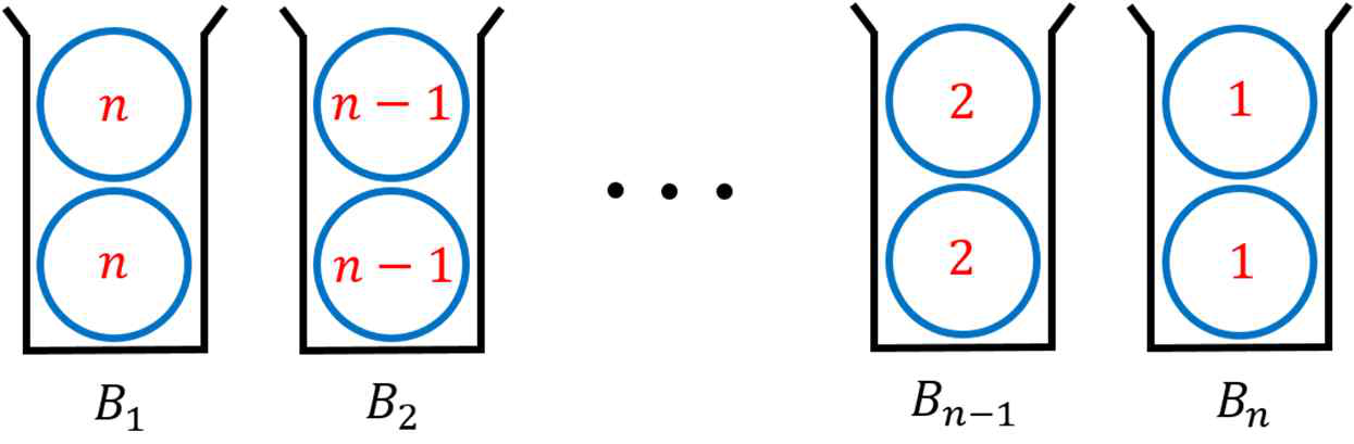 有 $n$ 个排成一行的箱子和 $2n$ 个地上的球。球的编号从 $1$ 到 $n$,每个编号 $i$ ($1 \le i \le n$) 的球恰好有两个。对于 $1 \le i \le n$,第 $i$ 个箱子记为 $B_i$,每个箱子 $B_i$ 最多可容纳两个球。初始时,对于 $1 \le i \le n$,箱子 $B_i$ 中装有两个编号为 $n + 1 - i$ 的球。初始配置见下图 F.1。