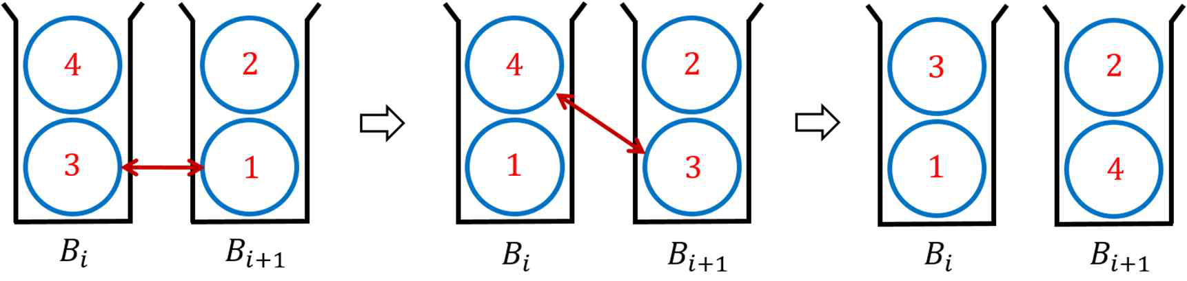 你可以交换相邻箱子中的两个球,这算作一次交换操作。注意,箱子不是栈,对于相邻的箱子 $B_i$ 和 $B_{i+1}$,你可以交换 $B_i$ 中的两个球之一与 $B_{i+1}$ 中的两个球之一。见下图 F.2。该图展示了两次交换操作。