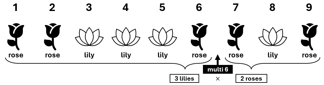 对于第一个测试用例,九朵花的排列如下图所示。响应第三次询问时,返回 $l_6 \times r_6 = 3 \times 2 = 6$;响应第四次询问时,返回 $l_3 \times r_3 = 1 \times 3 = 3$。由于 $l_5 = r_5 = 3$,因此 $k = 5$ 是一个正确的输出。