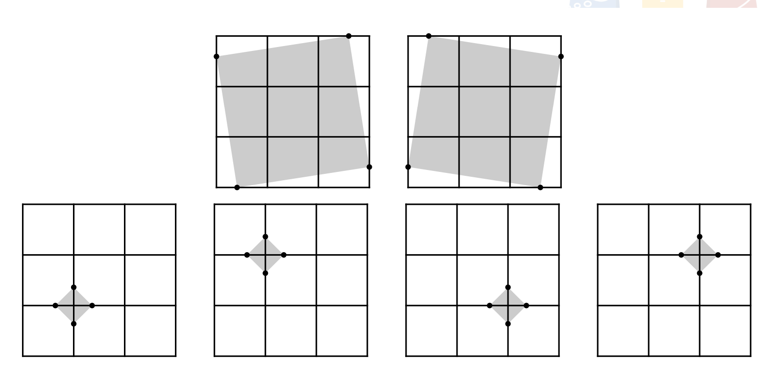 对于询问 1 和 2,合法的放置方案如图 I.1 所示。上方两个放置方案对应询问 1,下方四个对应询问 2。在每个放置方案中,阴影区域表示由这些点构成的正方形。