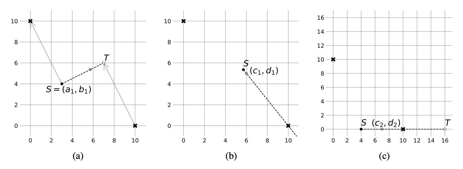 在场景 2 中,从 $S = (a_2, b_2) = (4, 0)$ 出发。选择 $(10, 0)$ 同时作为 $P$ 和 $Q$。确定点 $T$ 的坐标为 $(16, 0)$。点 $(c_2, d_2) = (7, 0)$ 位于线段 $ST$ 上,因此可以在一步内到达。(图 M.1 (c))