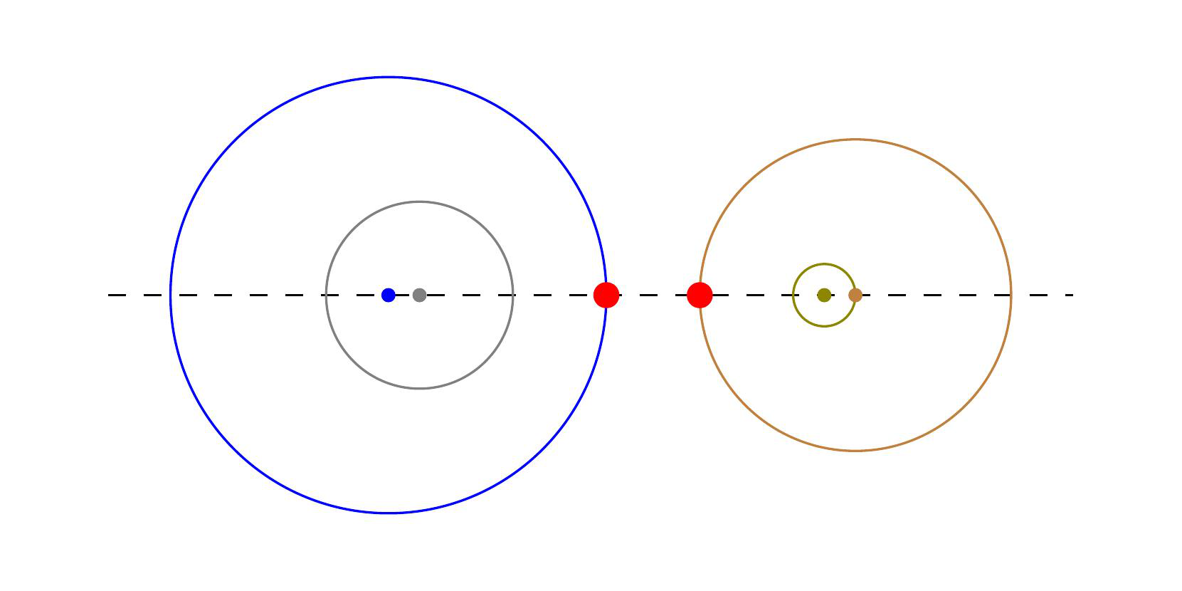 样例 1 的解释:第一张图展示了一个可行排列,其中每个圆及其圆心用独特的颜色标出。