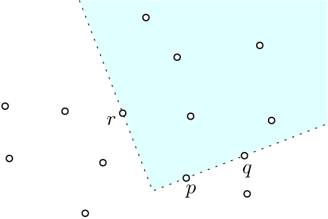 现在,考虑平面 $\mathbb{R}^2$ 中的一个点集 $P$。我们对由点集 $P$ 定义的象限感兴趣。具体来说,令 $\mathcal{Q}$ 为所有满足其边界恰好包含 $P$ 中三个点的象限 $Q$ 的集合。如果一个象限 $Q \in \mathcal{Q}$ 的内部恰好包含 $k$ 个 $P$ 中的点,则称其为 $k$-象限。下图展示了一个例子,其中点集 $P$ 由 14 个点(小圆圈)组成,你可以看到一个 $Q \in \mathcal{Q}$ 的 5-象限(青色阴影部分),其边界包含三个点 $p, q, r \in P$。