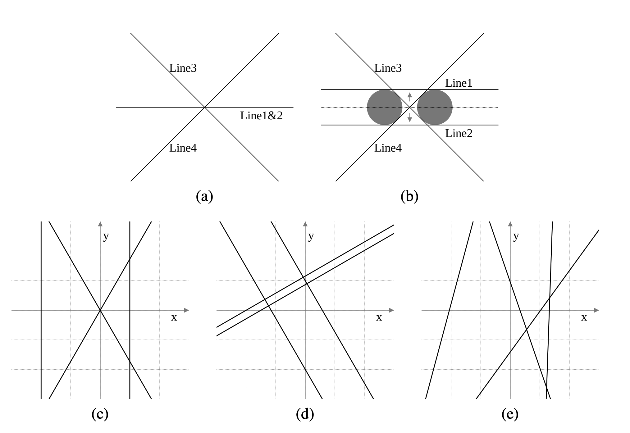 在样例输入 1 的第一个测试用例中,你必须移动前两条相同直线中的至少一条(图 L.1 (a))。对于 $\varepsilon > 0$,将一条直线沿 $y$ 轴正方向移动 $\varepsilon/2$,另一条沿 $y$ 轴负方向移动 $\varepsilon/2$,即可以 $\varepsilon$ 的代价实现目标。这会产生半径为 $\varepsilon/2$ 的圆的四条切线(图 L.1 (b))。由于 $\varepsilon$ 可以任意小,因此最小代价为 0。其余情况如图 L.1 (c) 至 (e) 所示。